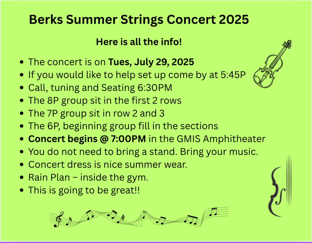 Our concert information for next week. (Tuesday, July 29th, 2025) Image Posted on July 22, 2025 by s_holgate –> Just one change. We will be in the air conditioned gymnasium instead of the heat of the night. Share this: Click to share on X (Opens in new window) X Click to share on Facebook (Opens in new window) Facebook Like Loading... Related